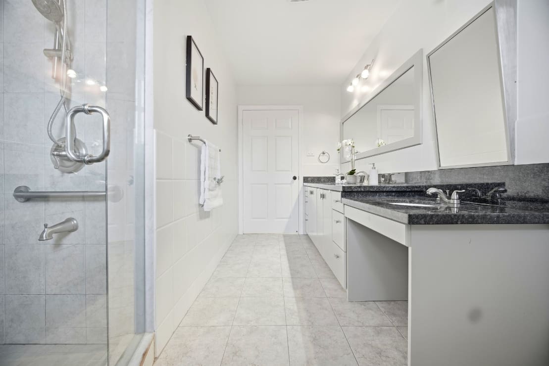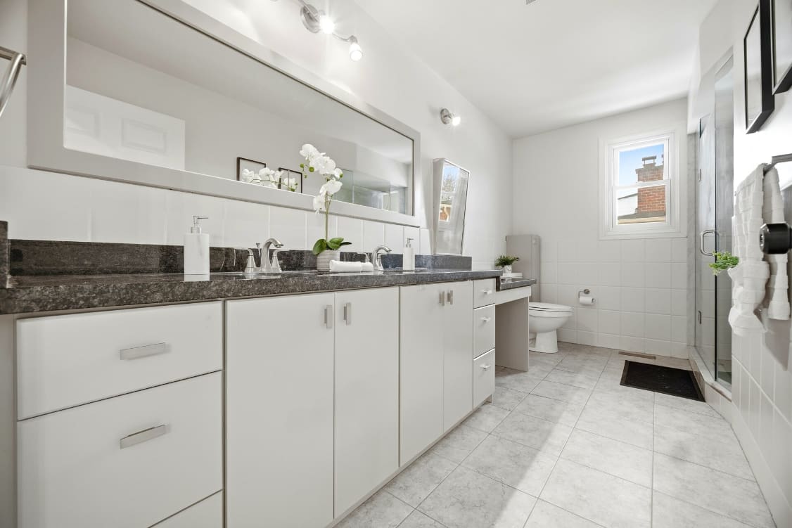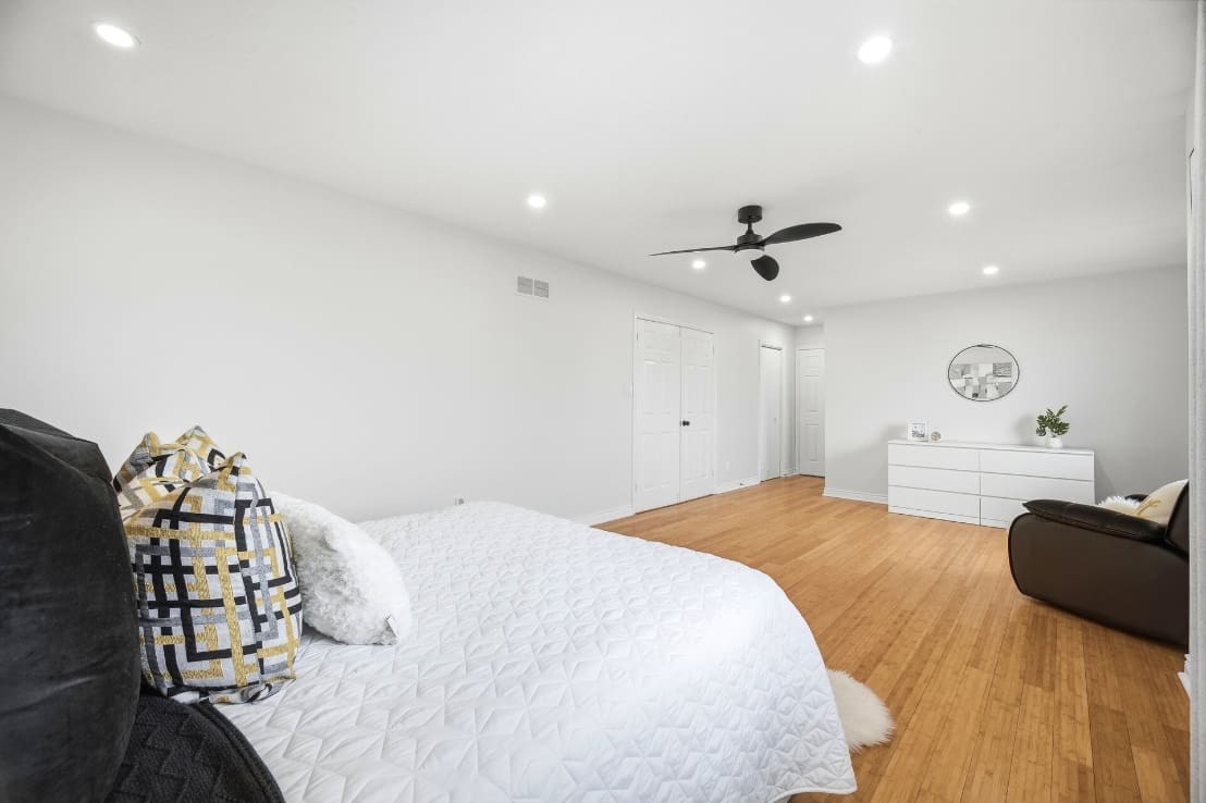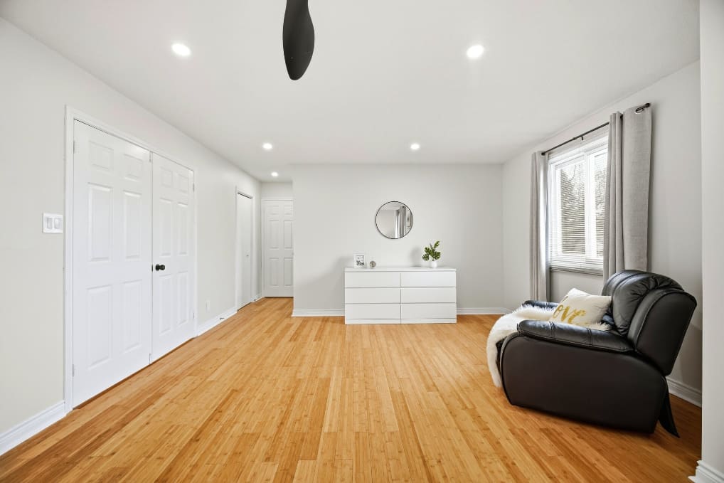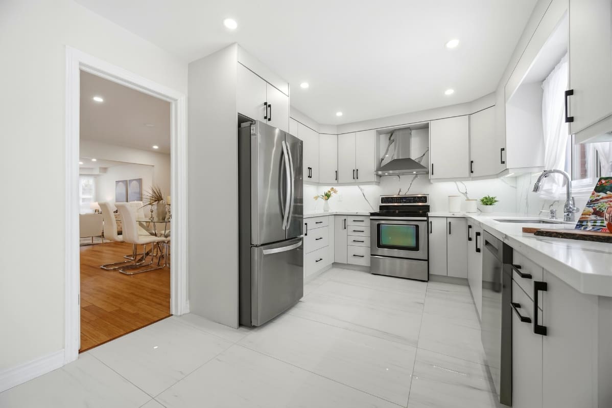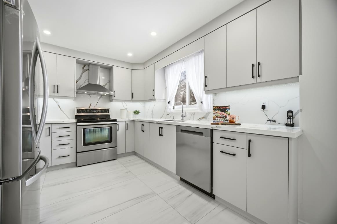 The main floor showcases stunning bamboo and porcelain flooring (2023) and features a renovated kitchen (2023) complete with quartz countertops, a pantry, updated range hood, and stainless steel appliances. The kitchen walks out to a west-facing patio, perfect for enjoying afternoon sun and evening gatherings. In addition to the spacious principal rooms, the main level also offers a private den, ideal for a home office or study space.
