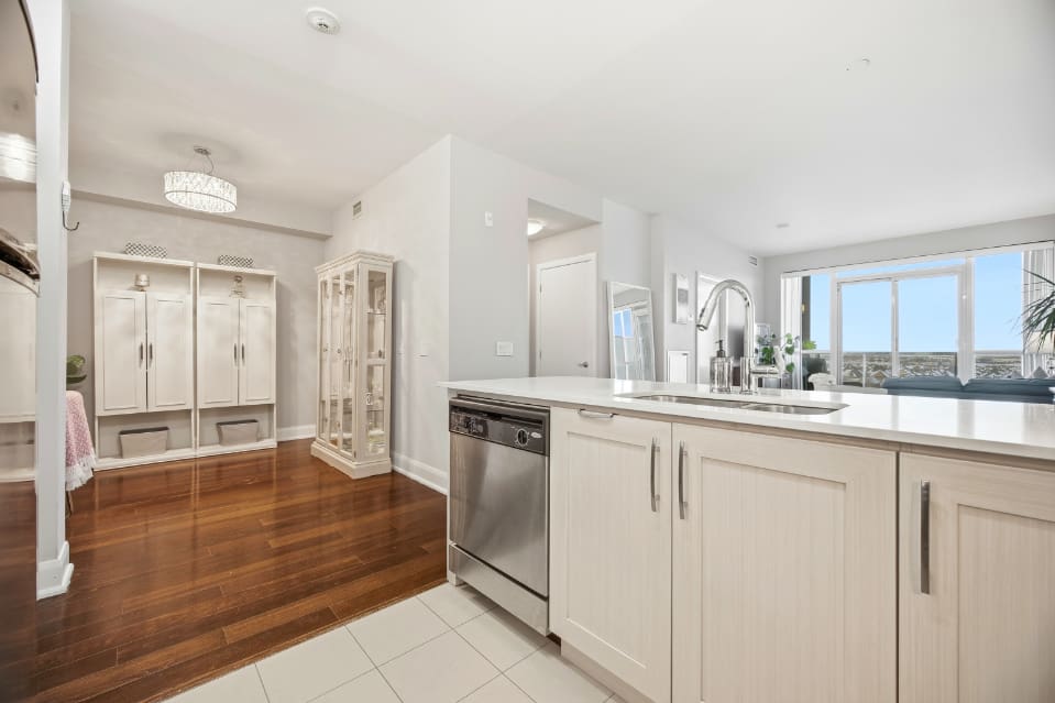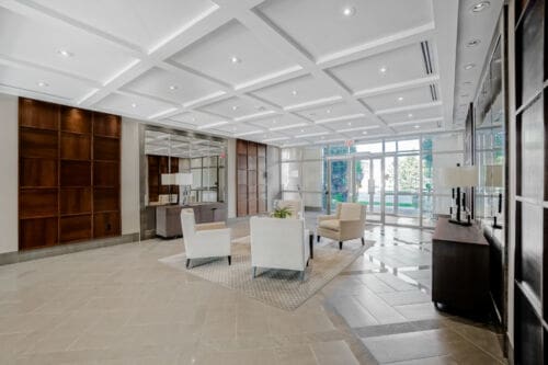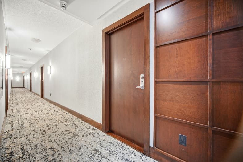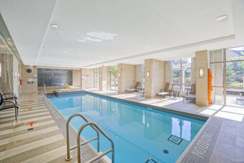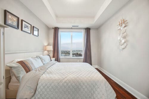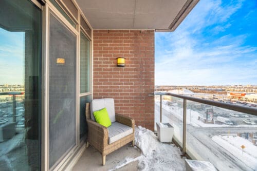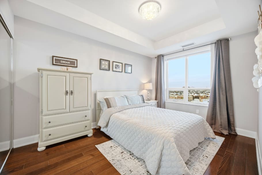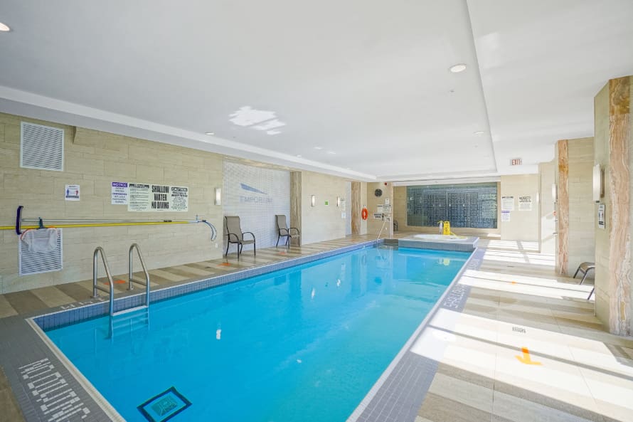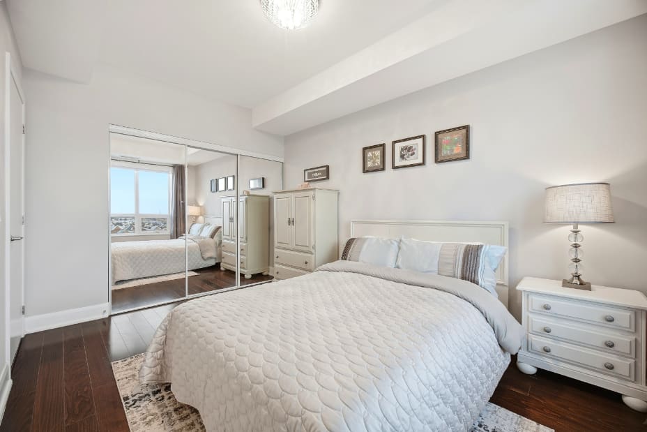 Wake up to breathtaking east-facing sunrise views in this stunning 1+1 bedroom condo at the Emporium, showcasing unobstructed city skyline and lake views. This beautifully upgraded suite offers 9-foot smooth ceilings, hardwood floors, and a bright open-concept design. The stylish kitchen features quartz countertops, porcelain floors, recessed lighting with glass backsplash, updated stainless steel appliances, and a breakfast bar that’s perfect for casual dining. The living room walks out to an open balcony, ideal for enjoying your morning coffee or taking in the sunrise views. A spacious den makes an ideal home office, while the bedroom includes a large wall-to-wall closet with custom built-in shelving. Thoughtfully decorated throughout. Enjoy exceptional amenities including an indoor pool, sauna and steam rooms, gym, theatre, party and meeting spaces, games room, children’s play area, concierge service, and 24-hour security. Just steps to Starbucks, Shoppers Drug Mart, TD Bank, salon, spa, and more, with quick access to Highways 403, 407, and QEW. One underground parking space and one locker included.