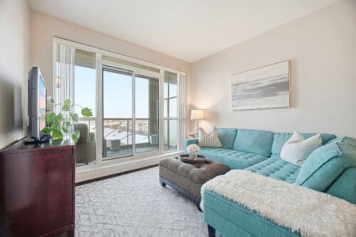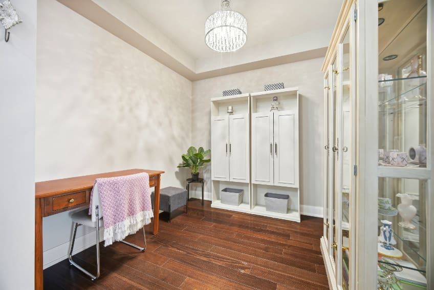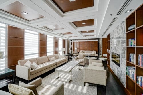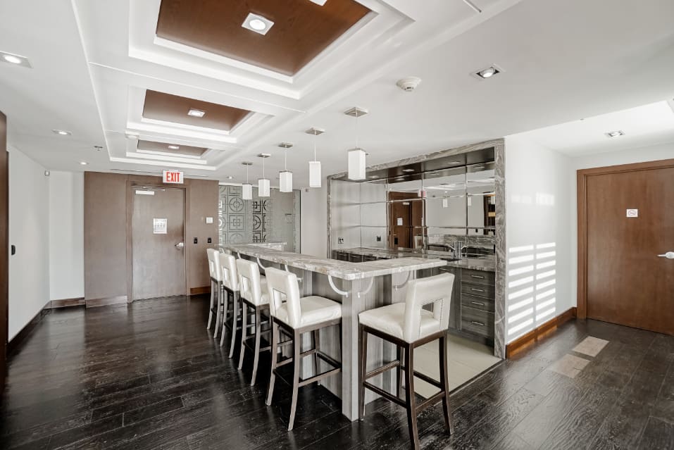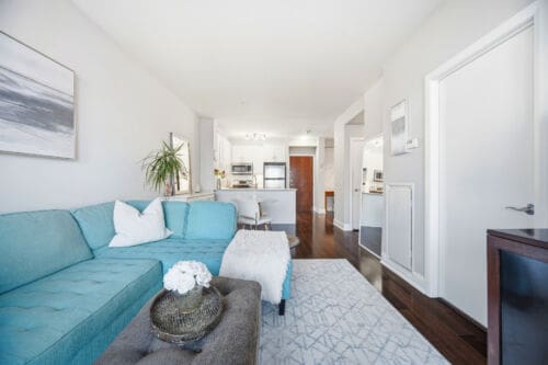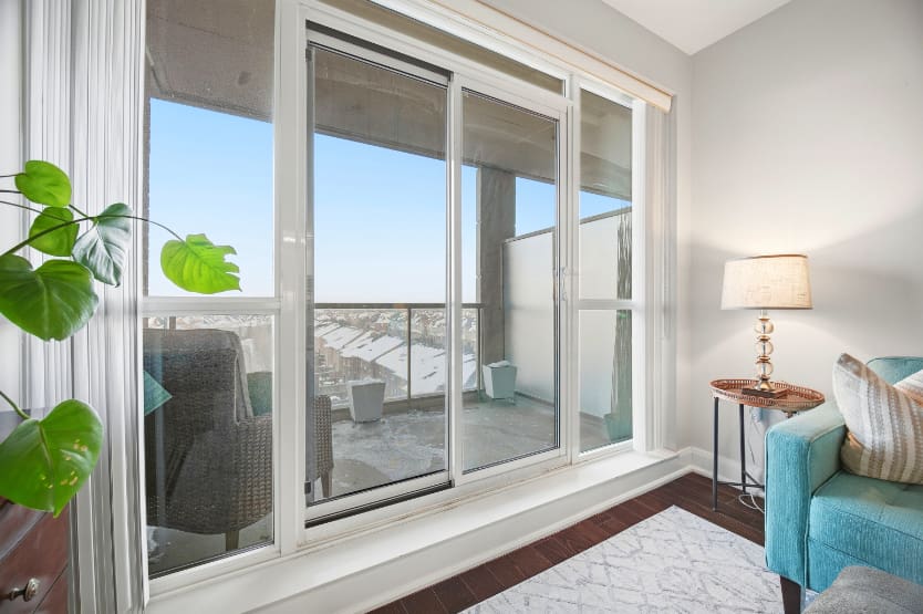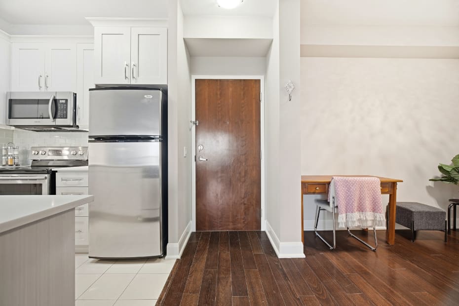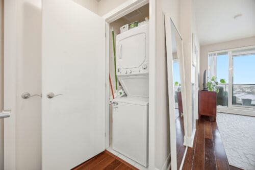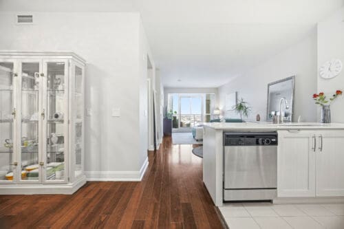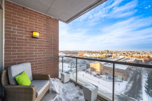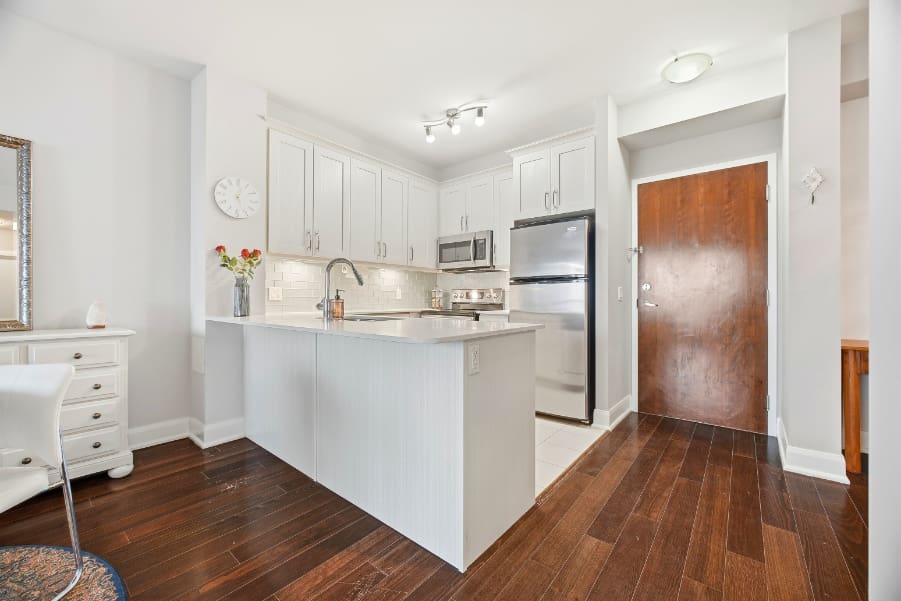 Wake up to breathtaking east-facing sunrise views in this stunning 1+1 bedroom condo at the Emporium, showcasing unobstructed city skyline and lake views. This beautifully upgraded suite offers 9-foot smooth ceilings, hardwood floors, and a bright open-concept design. The stylish kitchen features quartz countertops, porcelain floors, recessed lighting with glass backsplash, updated stainless steel appliances, and a breakfast bar that’s perfect for casual dining. The living room walks out to an open balcony, ideal for enjoying your morning coffee or taking in the sunrise views. A spacious den makes an ideal home office, while the bedroom includes a large wall-to-wall closet with custom built-in shelving. Thoughtfully decorated throughout. Enjoy exceptional amenities including an indoor pool, sauna and steam rooms, gym, theatre, party and meeting spaces, games room, children’s play area, concierge service, and 24-hour security. Just steps to Starbucks, Shoppers Drug Mart, TD Bank, salon, spa, and more, with quick access to Highways 403, 407, and QEW. One underground parking space and one locker included.
